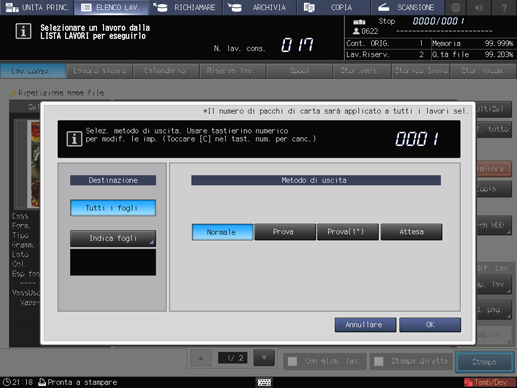 Per la destinazione, selezionare il foglio di uscita tra [Tutti i fogli] e [Indica fogli]. Se si seleziona un lavoro conservato spostato dall'elenco dei lavori riservati, oppure se si selezionano lavori multipli, [Indica fogli] non è disponibile.