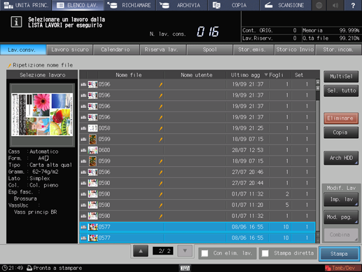 Premere [Sel. tutto] per selezionare tutti i lavori in elenco. Premendo questo tasto si selezionano tutti i lavori in elenco, ma [MultiSel] appare invece evidenziato.