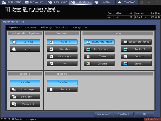 È possibile impostare la scansione separata, la direzione di rilegatura di un originale fronteretro (sia che il lato superiore e inferiore di entrambi i lati siano uguali o un lato sia invertito verticalmente), la direzione originale e il tipo originale.