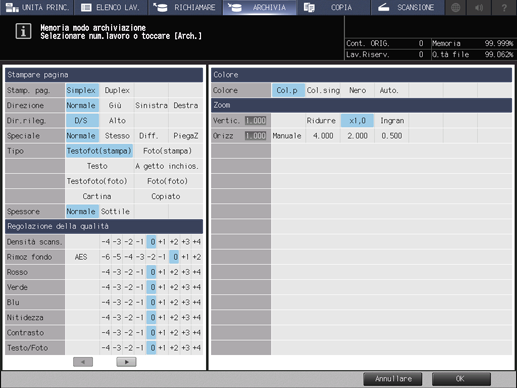 Per modificare le impostazioni da registrare, premere [Annullare] nella schermata che mostra le impostazioni, quindi premere [Annullare] nella schermata [Memoria modo archiviazione]. È di nuovo visualizzata la schermata [ARCHIVIA]. Nella schermata [ARCHIVIA] modificare le condizioni di scansione.