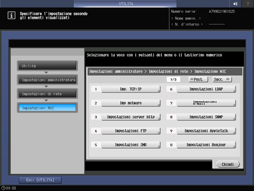 È possibile specificare le impostazioni di rete della macchina selezionando Utilità/Contatore - [Impostazioni amministratore] - [Impostazioni di rete] - [Impostazioni NIC].