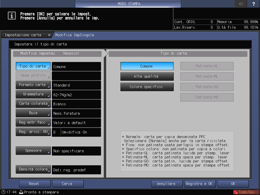 Premere [Impostazione carta] nella schermata [MODO STAMPA] per visualizzare la schermata [Impostazione carta], quindi premere [Modif. imp.].
