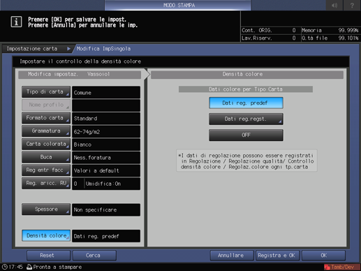Per usare i dati regolazione sensore colore per ogni tipo di carta per la correzione, premere [Dati reg.regst.] per visualizzare la schermata [Elenco reg.sens.col.ogni tipo carta] e selezionare i dati regolazione sensore colore per il tipo carta desiderato, quindi premere [OK].