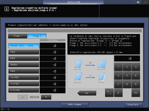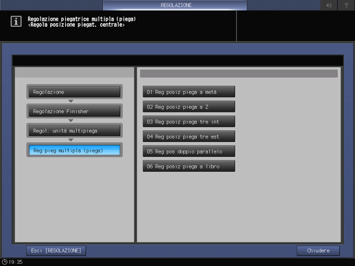Premere in sequenza [Regolazione Finisher], [Regol. unità multipiega], [Reg pieg multipla (piega)], e [Reg posiz piega tre int].