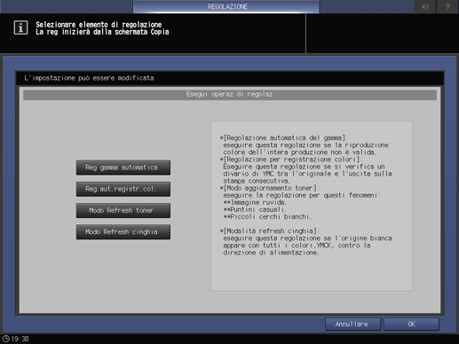 Eseguire l'operazione di regolazione nelle modalità Regolazione automatica gamma, Reg. registrazione colore., Aggiorna toner e Refresh cinghia.