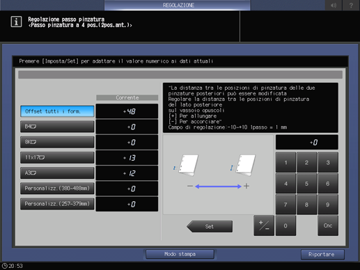 Premere in sequenza [Regolazione Finisher], [Regol.unità pinzatore sella], [Regolaz passo pinzatura], e [Passo pinz.4pos.(2ant.)].