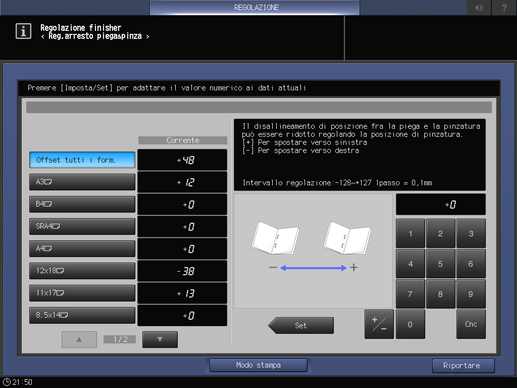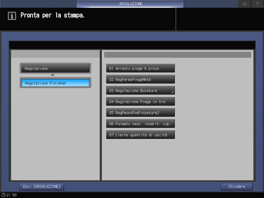 Se occorre una regolazione, premere [Uscita Stampa] per tornare alla schermata [Reg.arresto piega&pinza].
