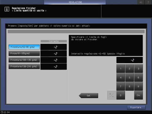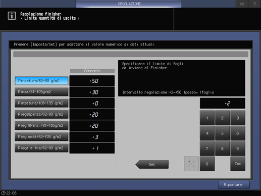 Premere in sequenza [Regolazione Finisher] e [Limite quantità di uscita].