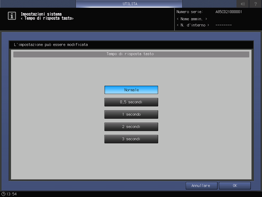 Selezionare l'intervallo di tempo per la ricezione della risposta dalla macchina quando si preme un tasto o pulsante nel pannello a sfioramento o pannello di controllo.