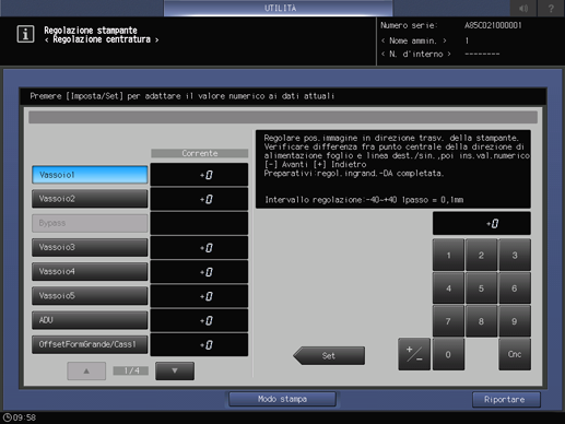 Questa operazione è la stessa di [Regolazione] - [Regolazione macchina] - [Regolazione stampante] - [Regolazione centratura], accessibile dalla schermata [MACCHINA].