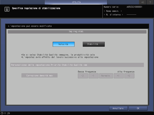 Selezionare se dare priorità alla velocità di stampa o alla stabilità della qualità immagine per i lavori. Quando si seleziona la stabilità della qualità immagine, impostare la frequenza della correzione densità massima per ogni voce.