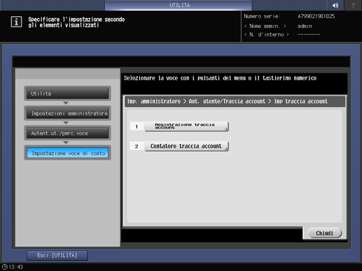 Premere [Aut.utente/perc.vc.costo] nella schermata [Impost. amministratore], quindi premere in sequenza [Impostazione voce di costo] e [Contatore voce di costo].