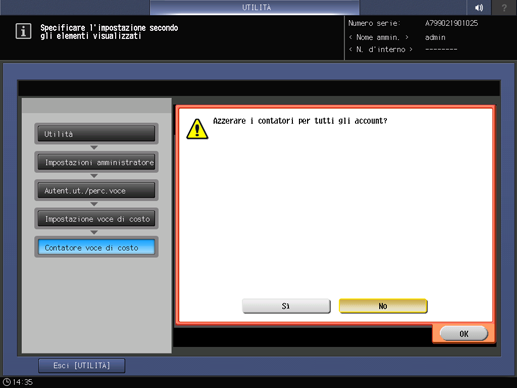 Selezionare una voce e premere [Contatore azzerato] per visualizzare la finestra di dialogo di conferma. Premere [Sì] o [No], quindi premere[OK] per completare l'impostazione.
