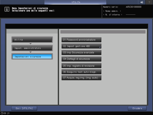 Sulla schermata [Menu Impostazioni amministr sistema], premere in sequenza [Impostazioni sicurezza] e [Eseguire test auto-diagn.].