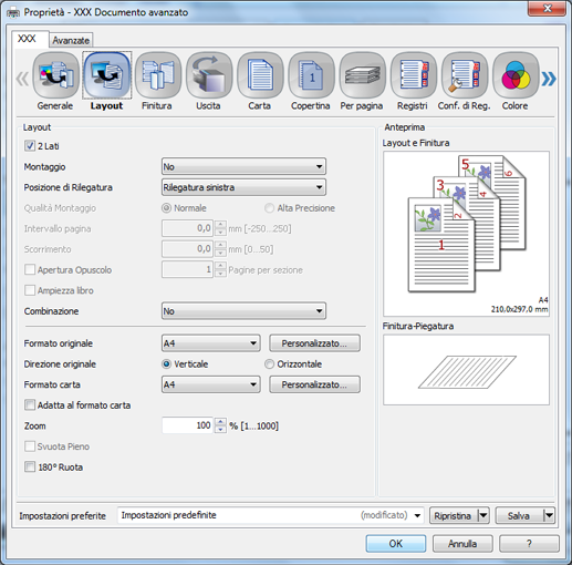 Quando si imposta il driver di stampa, accertarsi che non vi siano impostazioni precedenti rimaste in ogni voce nelle schede [Layout], [Finitura], [Copertina], ecc.