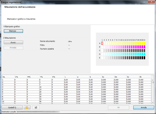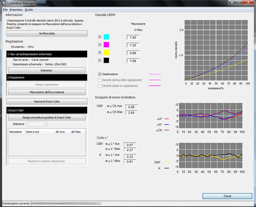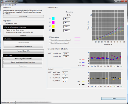 Dopo la misurazione, verificare la densità CMYK, il bilanciamento del grigio, e altri risultati per determinare se è necessaria la regolazione avanzata del controller.