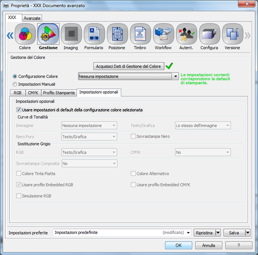 Fare clic su [Impostazioni opzionali] quindi deselezionare [Usare impostazioni di default della configurazione colore selezionata].