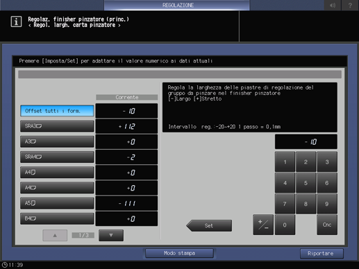 Esempio: restringere la larghezza della carta pinzatura per [Offset tutti i form.] (tutti i formati carta) di 1 mm.
