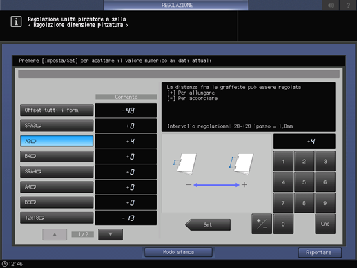 Quale esempio, qui di seguito è spiegato come regolare la dimensione pinzatura per allargare larghezza pinzatura finita di 4 mm.