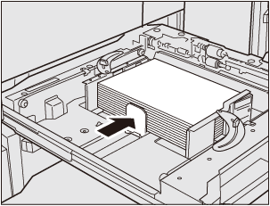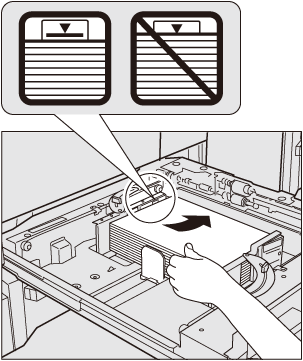 Non caricare più di 500 fogli (80 g/m2/21 lb Bond) nel vassoio 1 (vassoio superiore), o più di 1000 fogli (80 g/m2/21 lb Bond) nel vassoio 2 (vassoio inferiore). Inoltre, non caricare carta oltre il limite indicato nella piastra guida laterale. Altrimenti, può verificarsi un inceppamento della carta. Se si spinge con la forza il vassoio nella stampante con la carta caricata vicino al limite si potrebbe disallineare la pila di carta. Spingere delicatamente il vassoio nel corpo principale.