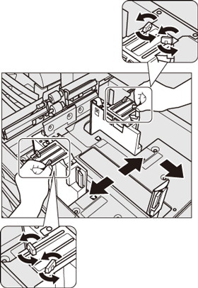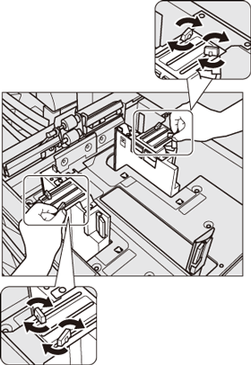 Quando si spostano le piastre guida laterali, accertarsi di tenere la leva di rilascio blocco di quella anteriore e la maniglia di quella posteriore. Se spostate solo con la piastra guida laterale anteriore, la piastre guida laterali potrebbero non essere fissate in posizione.