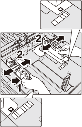 Spingendo la leva di rilascio blocco della piastra guida laterale , spostare la piastra guida laterale fino a una posizione appropriata, secondo l'indicazione del formato presente nella piastra inferiore vassoio.