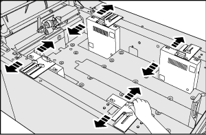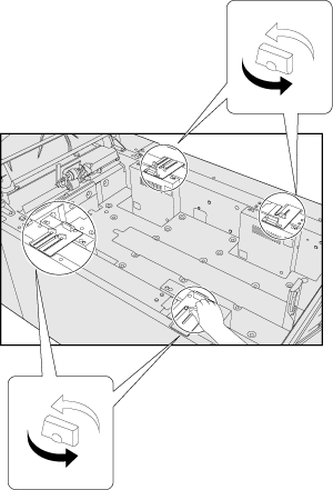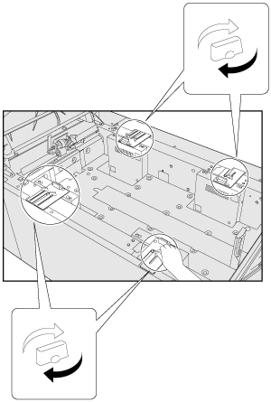 Ruotare le quattro manopole di fissaggio della guida laterale della piastra guida laterale (sinistra) e le due manopole di fissaggio della guida laterale della piastra guida laterale (destra) in senso antiorario per allentarle.