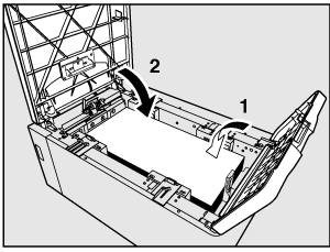 " anche se lo sportello superiore (destro) e lo sportello superiore (sinistro) sono chiusi. Ridurre la quantità di carta banner fino a quando la cima alla pila è a livello con la linea dell'etichetta standard de limite superiore della carta banner indicata nella piastra guida laterale (destra).