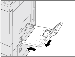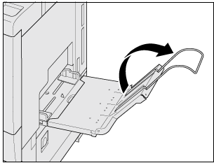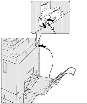 Spingere verso il basso il sensore del formato carta del Vassoio multibypass MB-506 e posizionare l'Unità vassoio banner MK-740 o l'Unità di rinforzo del vassoio di uscita per banner MK-740m (vassoio di estensione dell'alimentazione) sul vassoio bypass iniziando dall'alto a destra per coprirlo.
