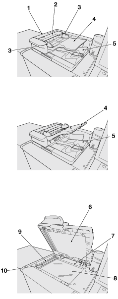4 | Vassoio alimentazione originali | Consente di caricare l'originale da scansionare nella macchina. Si possono impostare fino a 300 fogli. Si apre verso l'alto per consentire la rimozione dell'originale inceppato. |