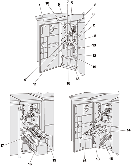 1 | Sportello anteriore unità di relè | Si apre per consentire la rimozione dell'inceppamento carta o l'alimentazione dell'acqua al serbatoio umidificatore dell'Umidificatore HM-102. |