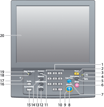 5 | Interruzione | Sospende la copiatura/stampa/scansione in corso per effettuare un lavoro di copiatura urgente. Il LED Interrompi lampeggia fino a quando la macchina è pronta nel modo Interrompi. Quando la macchina è pronta per la modalità Interrompi, il LED Interrompi si accende in modo fisso. |