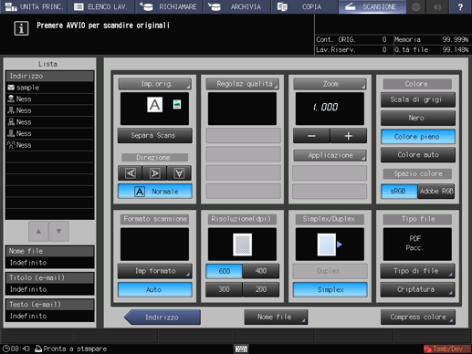 Le schermate della funzione di scansione comprendono la schermata per selezionare gli indirizzi e la schermata per configurare le impostazioni di scansione.