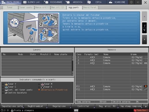 La spia della Cartuccia pinzatrice nell'area [Indicatori consumabili e scarti] della schermata [MACCHINA] si illumina di rosso, e il colore del testo diventa giallo.