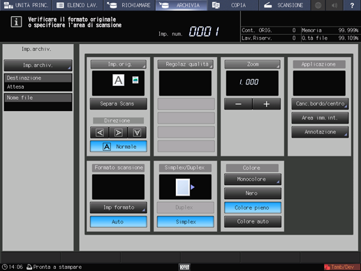Per informazioni dettagliate sull'impostazione scansione, fare riferimento a Schermata ARCHIVIA.