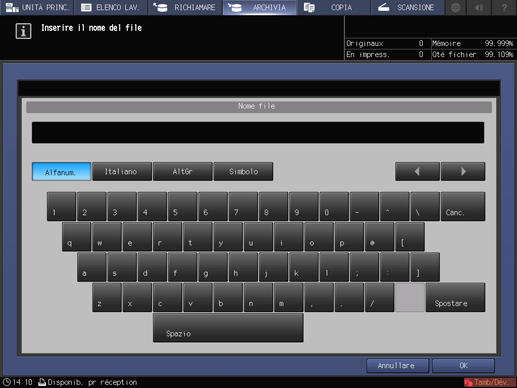 Premere [Nome file], inserire il nome del file (utilizzando un massimo di 127 caratteri da un byte), quindi premere [OK].