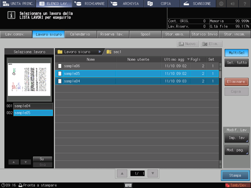 Premere [Sel. tutto] per selezionare tutti i lavori in elenco. Premendo questo tasto si selezionano tutti i lavori in elenco, ma [MultiSel] appare invece evidenziato.