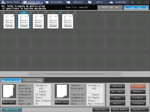 Per visualizzare la schermata [Modif imp. lav] (fare riferimento a Usare l'HDD: modificare l'impostazione di stampa di Cons. lavoro (Modif imp. lav)), premere la scheda [Modif imp. lav]. Per tornare alla schermata [Modif. pag. immag.], premere la scheda [Modif. pag. immag.].