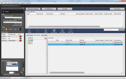I lavori di stampa salvati nella casella selezionata vengono visualizzati.