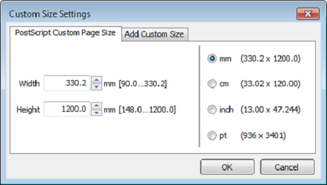 Fare clic su [Personalizzato] rispettivamente per il formato documento e il formato carta, inserire la larghezza (in larghezza) 330,2 mm/larghezza (in larghezza) 13", l'altezza (in lunghezza) 1200,0 mm/altezza (in lunghezza) 47,24", e fare clic su [OK].