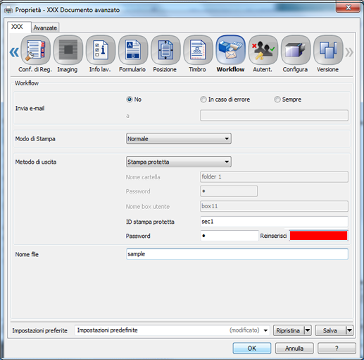 Nella scheda [Workflow], selezionare la casella di controllo [PDF/VT-2 Ricerca dei file esterni], e inserire il nome della sotto-cartella. In questo esempio, inserire il nome della sotto-cartella, "CompanyA", della sotto-cartella creata all'interno della cartella pdfvt. Successivamente, fare clic su [OK].