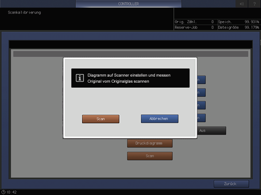Dieser Bildschirm wird angezeigt, wenn Sie auf Scankalibrierung im Bildschirm Controller-Systemeinstellungsmenü drücken. Ausführliche Informationen darüber, wie der Bildschirm Controller-Systemeinstellungsmenü aufgerufen wird, finden Sie unter Überblick über den Controller.