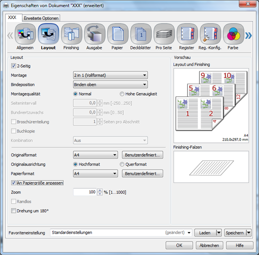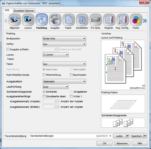 Stellen Sie bei den Einrichtungsaktivitäten im Druckertreiber sicher, dass keine früheren Einstellungen mehr in den Registern Layout, Finishing, Deckblatt usw. aktiv sind.