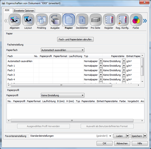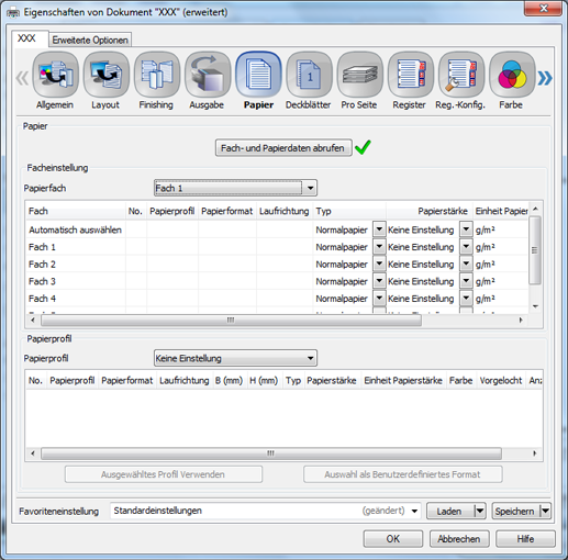 Klicken Sie auf das Register Papier und anschließend auf Fach- und Papierdaten abrufen.