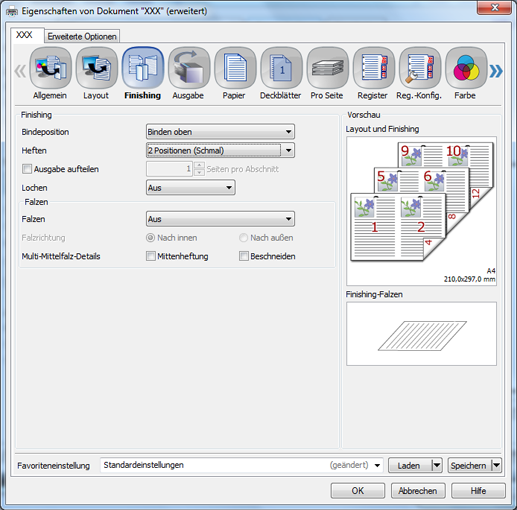 Klicken Sie auf das Register Finishing und legen Sie dann die Einstellungen unter Heften fest.