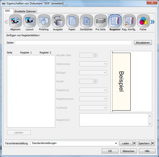 Seiten | - | Legen Sie eine Seite fest, an der ein Registerblatt eingefügt werden soll. Zum Übernehmen der Einstellungen klicken Sie auf Aktualisieren. |