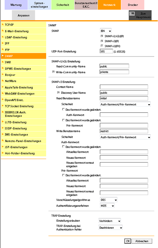 In diesem Bildschirm können Sie die Einstellungen für den Abruf von Informationen über das System oder die Überwachung des Systems per SNMP (Simple Network Management Protocol) einrichten.