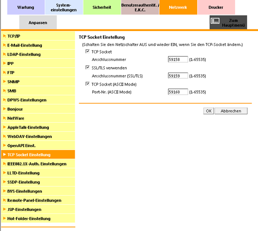 Klicken Sie auf TCP Socket Einstellung im Menü des Registers Netzwerk, um diesen Bildschirm aufzurufen.