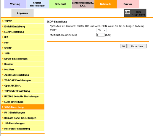 In diesem Bildschirm können Sie festlegen, ob SSDP (Simple Service Discovery Protocol) verwendet werden soll. Wenn SSDP aktiviert ist, kann über Software und andere Dienste im Netzwerk der Dienst gefunden werden, den das System anbietet. Wenn SSDP verwendet wird, ändern Sie gegebenenfalls Multicast TTL (Time To Live).