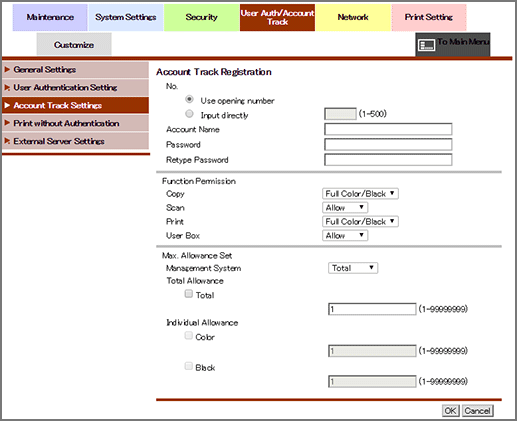 supplementary explanationIf the Account Track Input Method in General Settings is set to Password Only, this item is dimmed.